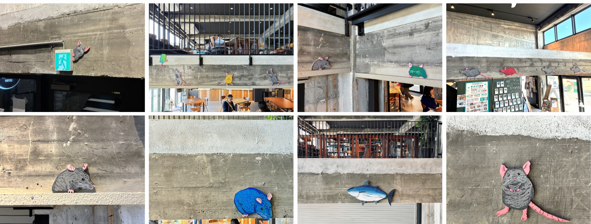 YAIZU PORTERSには様々な人々が訪れ出会いの場となっている。その多様性が交差する空間を活用し、ネズミたちの多様性を表現したインスタレーションとした。